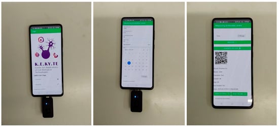 Representation of the user interface of the bespoke app developed by Apostolakis et al. []. Prior to the measurement of a saliva sample with the aid of a portable bioelectric biosensor [] (attached to the smartphone via a USB port) (left), the user inputs personal and historical data (e.g., age, gender, status of vaccination against SARS-CoV-2, etc.) (middle). After the completion of the three-minute assay, a QR code is generated containing the test results (right).