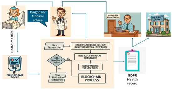 Simplified representation of blockchain integration with POC health monitoring in the workplace. Blockchain ensures that once a POCT result is entered, it cannot be modified without network consensus. This builds trust between employees, employers and health providers by securing sensitive health data against hacking, falsification or unauthorized access.