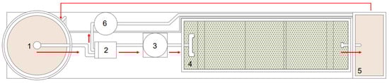 Aquaculture system at the Leiria Polytechnic Institute. Components: (1) fish tank; (2) drum filter; (3) biological filter; (4) grow bed; (5) sump reservoir; and (6) conical sedimentation tank.