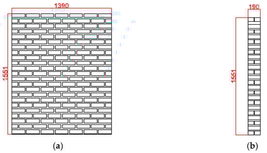 Masonry wall specimen for shaking table test: (a) front view; (b) side view (unit: mm).