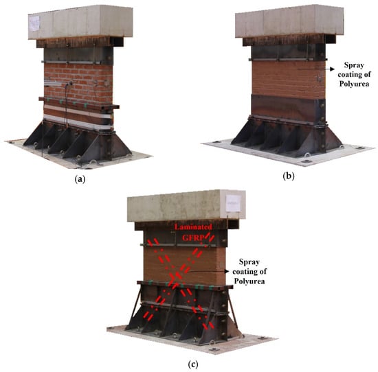 In the shaking table test, the masonry wall specimen had dimensions of 1390 mm × 1551 mm × 190 mm and weighed 700 kg, as shown in Figure 1. The clay brick dimensions were 190 mm × 57 mm × 90 mm and comprised 23 layers with 10 mm mortar joints. The compressive strengths of clay brick and mortar are 25 and 16 MPa, respectively. Three different types of masonry wall specimens were prepared, as illustrated in Figure 2. The first type, designated as MWN, consisted of non-retrofitted control specimens. The second type, MWP2, was retrofitted with a 2 mm thick layer of STPU. The third type, MWP5, consisted of specimens retrofitted with X-shaped laminated GFRP strips, 5 mm in width, followed by the application of a 2 mm thick STPU layer on top. The GFRP used for strengthening had a tensile strength of 900 MPa and an elastic modulus of 45 GPa. A total of three MWN specimens were fabricated, including one for preliminary testing, whereas two specimens were prepared for each of the retrofitted types, MWP2 and MWP5.