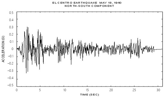 The experimental configuration for the shaking table test is illustrated in Figure 3. To connect the specimen to the shaking table, the masonry wall was mounted on top of a 2300 × 300 × 1500 mm concrete slab and fixed using bolts. A 1750 × 370 × 540 mm concrete block was placed on top of the masonry wall to apply vertical loading and generate inertial forces during the shaking table test. Steel brackets were installed at the bottom 880 mm and top 440 mm of the wall. This restraint configuration was intentionally designed to prevent premature failure at both ends of the wall and to guide damage initiation toward the center. This setup ensured that the failure occurred within the retrofitted region, allowing for clearer observation of the strengthening effects across specimen types. Although this configuration may differ from real boundary conditions in building walls, it enabled controlled crack development and reproducible comparison between experimental and numerical results. The seismic load was applied in the out-of-plane direction using El Centro earthquake records, as shown in Figure 4. The El Centro ground motion was selected due to its historical significance and well-characterized frequency content (1–2 Hz), which overlaps with the natural frequency range of typical unreinforced masonry structures [32,33]. The load was first applied with a peak ground acceleration (PGA) of 0.1 g and then increased by 0.1 g increments until the specimen failed.