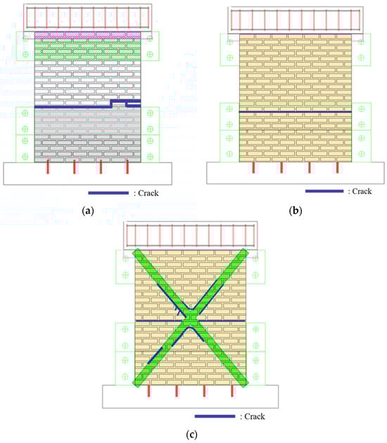 Typical crack patterns observed in the shaking table tests: (a) MWN type; (b) MWP2 type; (c) MWPF5 type.
