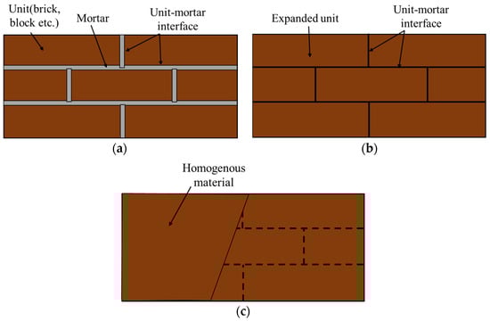 Finite element modeling methods of masonry wall: (a) detailed micro-model; (b) simplified micro-model; (c) macro-model [34,35].