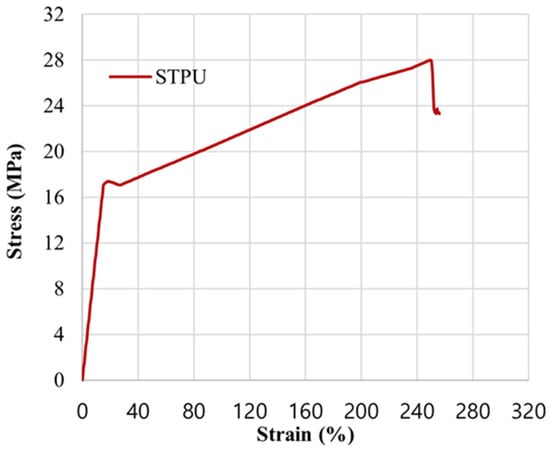To reflect the physical properties of STPU in the numerical analysis, the strain–stress data obtained from the tensile strength test were applied to the material model, as shown in Figure 8 [30].