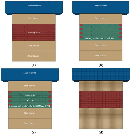 Finite element modeling of shaking table test specimens: (a) MWN; (b) MWP2; (c) MWPF5; (d) meshed specimen.