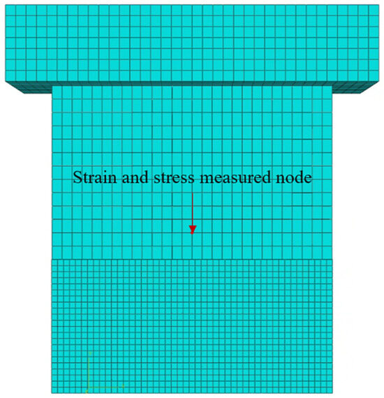 The central strain and stress derived from the simulation analysis of each specimen are summarized in Table 5. The simulation analysis results collected from the nodes are shown in Figure 11. The central strain and stress data were collected from the node above the lower fixed bracket, where the greatest damage was observed during the shaking table test. Based on the study by Yang et al. (2019), cracking was considered to occur when the strain exceeded 0.00015 [42]. To estimate the stress causing the destruction of the masonry wall, the tensile strength of the mortar was calculated. Based on the measured compressive strength of the mortar (16 MPa), its tensile strength was estimated to be 0.8 MPa by assuming a typical ratio of tensile to compressive strength for cement-based mortar. This estimate follows the empirical range of 1/10 to 1/20 commonly reported in the literature. In this study, a conservative value at the lower end of this range (1/20) was adopted [43].