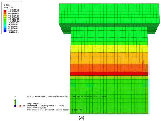 The failure of the specimens, as identified through stress analysis in the simulation, first occurred at PGA values of 0.5 g, 0.7 g, and 0.8 g for the MWN, MWP2, and MWPF5 specimens, respectively. The PGA values at which failure occurred in the numerical analysis closely matched those observed in the shaking table tests. Figure 12 presents stress contours at the PGA levels where initial failure was identified in the numerical simulation, as summarized in Table 5. For the MWP2 and MWPF5 specimens, stress localization corresponding to the onset of cracking appears clearly at 0.7 g and 0.8 g, respectively. In contrast, the MWN specimen did not exhibit failure within the applied PGA range; thus, a representative contour at 0.4 g is provided to illustrate the early-stage stress development. As shown in Figure 5, the experimentally observed cracks in the MWP2 specimen initiated in the immediate vicinity above the lower fixed steel bracket and propagated diagonally upward. This damage pattern was consistently observed across all specimen types. Similarly, the numerical stress distribution in Figure 12, corresponding to the MWP2 specimen, shows the highest stress concentrated in the same region. This close agreement between the experimental and numerical results confirms the model’s ability to accurately capture the damage concentration zones and overall failure behavior under out-of-plane seismic loading.