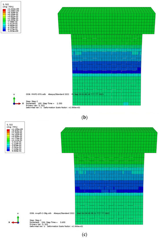 Stress contours at initial failure: (a) MWN at 0.4 g; (b) MWP2 at 0.7 g; (c) MWFP5 0.8 g.