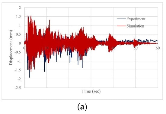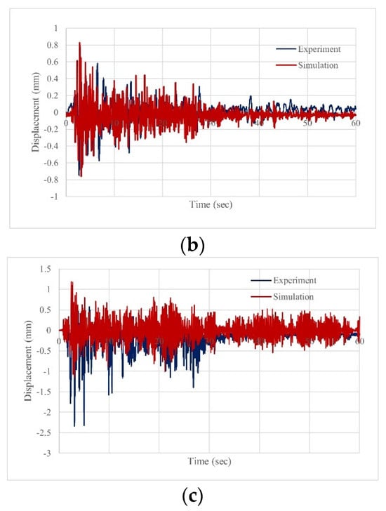 Comparison of time–displacement graph between simulation results and experimental data: (a) MWN (0.3 g); (b) MWP2 (0.3 g); (c) MWPF5 (0.3 g).