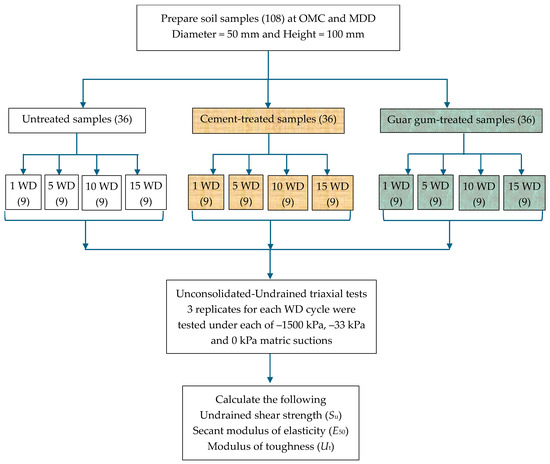 Bulk soil collected from the site was initially air-dried and then oven-dried at 105 °C for at least 24 h, following the guidelines outlined in BS 1377-1:2016 [29]. After drying, the soil was crushed and sieved through a 2 mm sieve to break apart clods and remove gravel-sized particles. This resulted in a uniform fine-grained matrix suitable for laboratory testing. Stabilising agents—either 6% ordinary Portland cement (OPC) or 1% guar gum (GG) by dry weight of soil—were carefully mixed with the prepared soil. This mixing was performed manually and supplemented with a mechanical mixer to ensure uniformity. Once the dry mixing was complete, water was incrementally sprayed onto the mixture and thoroughly blended until the target moisture content was reached. All samples were compacted at an approximately optimal moisture content (OMC) of 12% and 90% of the modified Proctor maximum dry density (MDD). Specimen preparation involved static compaction of the moist soil mixture within cylindrical moulds to create samples measuring 50 mm in diameter and 100 mm in height (height-to-diameter ratio of 2:1), which minimised boundary effects during triaxial testing. Each specimen was compacted in four layers to reduce air entrapment and promote uniform density. One hundred and eight samples were prepared and evenly divided into three groups: untreated, cement-stabilised, and guar gum-stabilised, with 36 samples in each group. Each group was further subdivided based on the number of wetting–drying (WD) cycles: 1, 5, 10, and 15, with nine replicates for each condition (Figure 1). The 1-cycle group served as control samples, representing the initial condition—they were compacted, cured, and reconstituted without undergoing cyclic moisture changes, thereby isolating the immediate effects of stabilisation without any environmental degradation. After compaction, all samples were cured under controlled laboratory conditions for 7 days at 25 ± 2 °C, wrapped in sealed plastic to prevent moisture loss. This curing period allowed for initial cement hydration and guar gum gel formation, while maintaining the same conditions for untreated samples to ensure consistency in the experiment. No additional water was added during the curing period, and all samples were handled carefully to prevent premature drying or shrinkage cracking, especially in the cement-treated samples.