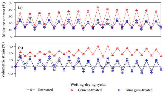 Figure 2. (a) Variation in moisture content between saturation (target wetting) and a matric suction of −1500 kPa (target drying) with wetting–drying cycles and (b) variation in volumetric strain with wetting–drying cycles for cement-treated, guar gum-treated, and untreated soil.