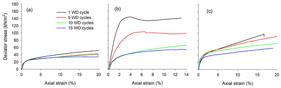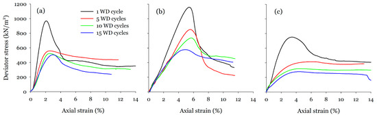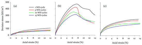 Figure 6. Deviator stress is plotted as a function of axial strain (average for three samples) measured at the matric suction of −33 kPa for (a) untreated soil, (b) cement-treated soil, and (c) guar gum-treated soil for 1, 5, 10, and 15 wetting–drying cycles.