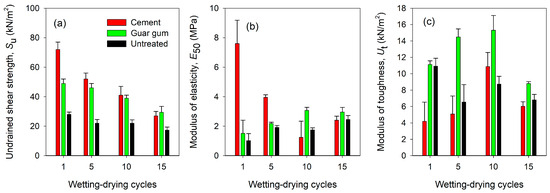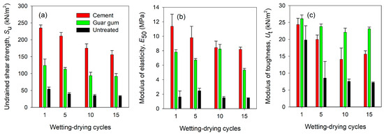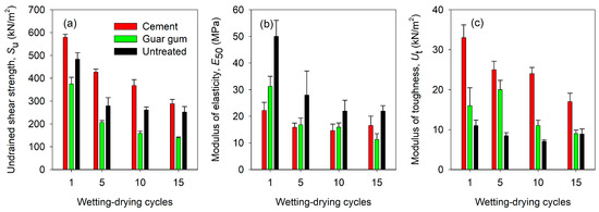 Figure 9. Variation in (a) undrained shear strength, (b) modulus of elasticity, and (c) modulus of toughness measured at saturation for untreated soil and soil treated with cement and guar gum, subjected to 1, 5, 10, and 15 wetting–drying cycles.