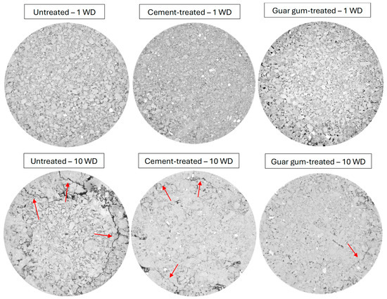 Figure 10. X-ray computed tomography (CT) grayscale images illustrate expansive soil samples’ internal microstructural evolution under cyclic wetting–drying (WD) conditions. The images compare untreated, cement-treated, and guar gum-treated samples after 1 and 10 WD cycles. All images represent horizontal cross-sections at mid-height of cylindrical samples, and cracks are marked with red arrows.