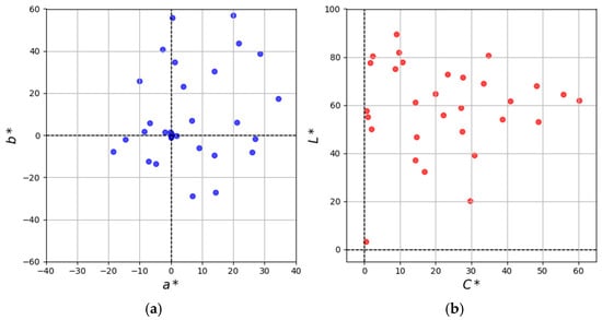Physical samples used for psychophysical experiments on CAAD. Diagrams of samples varying along dimensions  and  in the CIELAB space (a) and dimensions  and  (b).
