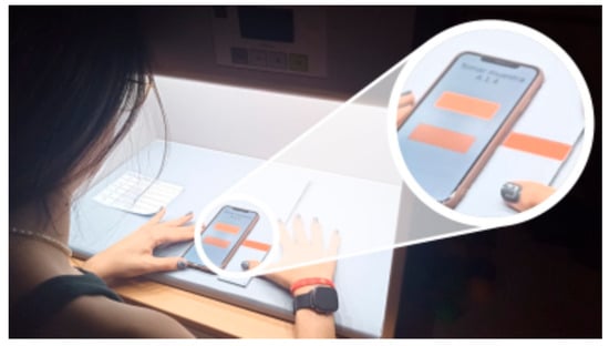 The visual assessments took place in a light booth, the JUST Normlicht LED Color Viewing Light, under D65 illuminant and 750 lx illumination level (JUST Normlicht, Langhorne, PA, USA). Eight observers (3 males and 5 females, aged between 22 and 25 years) with normal color vision (verified by Ishihara tests) participated. During testing, the iPhone XS Max was placed flat in front of the observers and viewed directly from above. As illustrated in Figure 3, the physical samples were held beside the display for direct comparison, with observers allowed to tilt both slightly for better judgment. The entire experiment was repeated for all 30 samples, with each observer completing three separate sessions. The order and positions of samples were randomized to eliminate repetition bias.