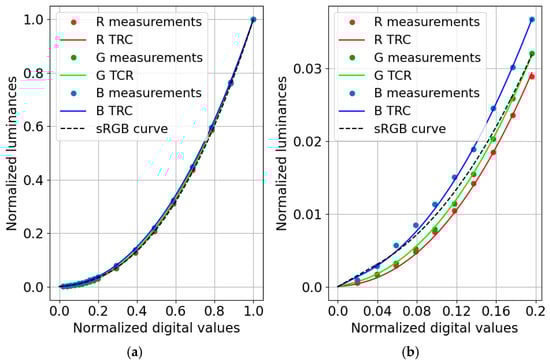Figure 5a presents an example of the TRC graph measured for the iPhone 12. The improvement in the fitting can be observed across the three channels, particularly in the region corresponding to low digital values, shown in Figure 5b. The scatter plots of the R, G, and B measurements represent the normalized luminance values obtained from single-channel images, where only one color channel is active (with values ranging from 0 to 255 on the horizontal axis) and the other two are set to zero. The R, G, and B TRC lines for each channel correspond to the function defined in Equation (2), fitted by minimizing the relative error. As shown in Table 3, the fitted parameters  and  vary between channels, even within the same device, and differ from the standard sRGB model parameters (, ), which assume identical behavior across all three channels. The sRGB model is represented by the black dashed line in Figure 5.