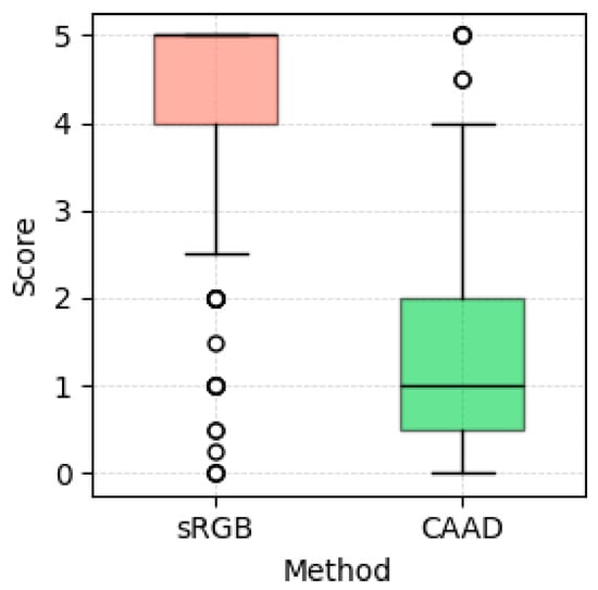 A visual comparison of the score distributions through a boxplot further reinforces the statistical findings. The boxplot in Figure 6 clearly illustrates that the CAAD model consistently received higher ratings than the sRGB method. Despite the presence of a few outliers and the slight overlap between the lower whisker of CAAD and the upper whisker of sRGB, the interquartile ranges remain completely separate, highlighting a marked difference in overall performance between the two models.