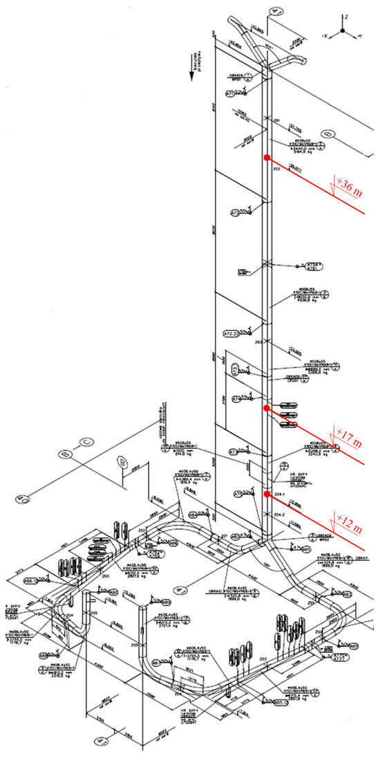 The object of measurements and analysis is the live steam pipeline in power-generating unit A of the power plant (Figure 3 and Figure 4). The noise generated in this pipeline exceeds permissible levels and reaches up to 105 dB. In the top span above the Y-pipe, before the valves, a Ø406.4 × 50 mm pipeline was used, which is different than the pipeline used in power unit B, where the diameters of the same pipelines are smaller, i.e., Ø355.6 × 40 mm. The upper Y-pipe has a diameter of Ø508/406.4 mm (power unit A), while the Y-pipe in the same location in power unit B has a diameter of Ø508/355.6 mm. The vertical span of the piping (Figure 4) below the Y-pipe, between the levels of 12 m and 37 m, has the same diameter as the one in power unit “B”, i.e., Ø508 × 55 mm. At the level of 23 m, there is a measuring nozzle with a diameter of Ø317.55 mm, which is larger than in power unit “B”, where the nozzle has a diameter of Ø297.58 mm. Towards the turbine, there is the lower Y-pipe, with identical dimensions as the upper Y-pipe, i.e., Ø508/406.4 mm, and it is followed by two branches of pipelines of the same diameter as the top pipelines, i.e., Ø406.4 × 50 mm.