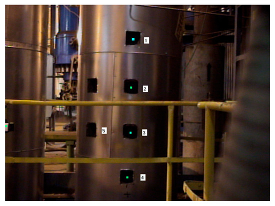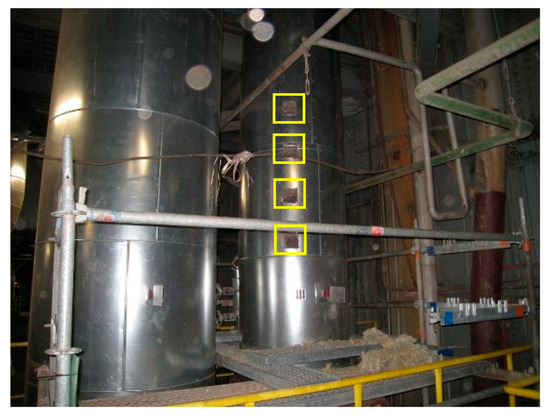 Vibration measurements were taken on power unit A, in which the live steam pipeline vibrated and generated noise at the level of 105 dB. For the purposes of comparison, vibration measurements were taken in the almost identical power unit B, where such problem did not occur. Vibration measurements of both pipelines were taken by means of a laser vibrometer. In order to measure the vibrations directly in both pipelines, holes were made in the thermal insulation at the following three levels of power unit A: 12 m, 17 m, and 36 m and at the level of 12 m in the control unit B, where excessive vibration and noise does not occur. The locations of the measurement points/levels were dictated by the expected structural modal vibrations modes and were selected to avoid vibration nodes. The exact height of the measurement levels (12, 17, 36) was dictated by the floor level of the building in which the pipeline was installed. Examples of measurement points are shown in Figure 5, Figure 6 and Figure 7. The holes were spaced at 0.40 m vertically and 45° around the circumference. Figure 6 shows the laser vibrometer system during vibration measurements.