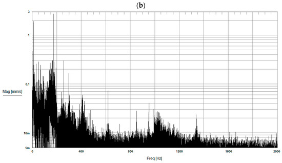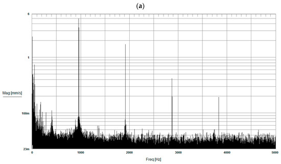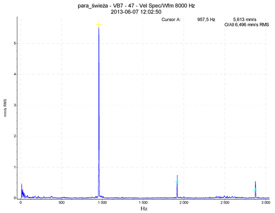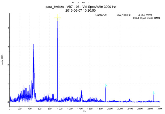 Figure 8 shows the amplitude–frequency plot for vibrations at the operating levels where measurements were made. The analysis also included the calculation of mode shapes, which are described in detail in [8], where it was concluded that they are of variable character similar to that of a sinusoidal waveform. The amplitude–frequency plot for vibrations of the live steam pipeline (Figure 8a) shows that in unit A, the dominating vibration frequency is 957 Hz, which was registered at all levels of unit A. On the other hand, the measurements taken on a similar power unit with identical parameters, except for the diameters of live steam pipeline, i.e., in power unit B, do not show this dominating frequency value, as illustrated in Figure 8b. The dominating vibration frequency in unit B is 7.5 Hz.
