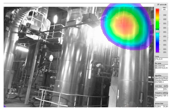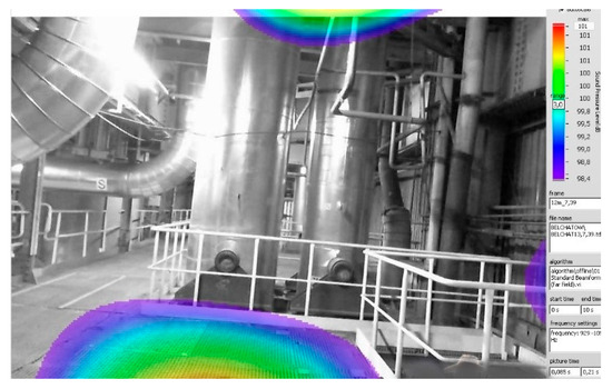 The analysis of pipelines included the measurement of the sound (noise) level in the live steam pipeline in power unit A using an acoustic camera array with 40 microphones (CAE Noise Inspector). The measurement frequency range was aiming to identify the noise source, preliminary observed roughly at the frequency of about 1 kHz. The results of such measurements are illustrated in Figure 12, Figure 13 and Figure 14. The measurements of the sound intensity level taken at the level of 12 m indicate that the sounds in the frequency range of 929 Hz ÷ 1059 Hz originate at higher levels (Figure 12). The bottom portion of the image shows the reflections of sounds located near the microphone. The sound intensity level was approximately 101 dB.