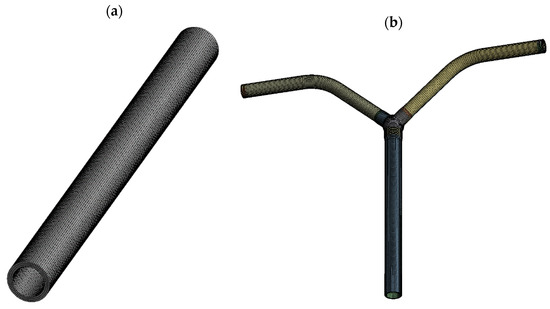 A numerical modal analysis was performed using the finite element method [9] in order to identify the frequency and mode shape in the frequency range above 900 Hz. This range is significant because of the potential excessive noise. FEM calculations were performed on [10] geometrical models of straight pipeline spans for pipes with the following dimensions: Ø508 mm × 55 mm, Ø406.4 m × 50 mm, and Ø355.6 mm × 40 mm, as well as on models of pipeline spans near the spherical Y-pipes. Due to the fact that these are thick-walled elements, their discrete models were created with division into solid elements [4], which are shown in Figure 15.