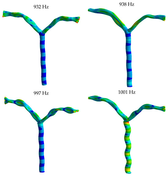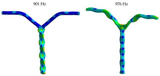 Figure 16 shows examples of the modal analysis results of FEM calculations for [1] a span of the live steam pipeline in power unit A for the natural vibrations frequency range of 900–1001 Hz in the pipeline’s nominal operating state.
