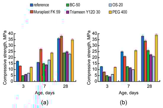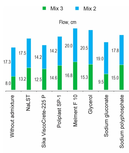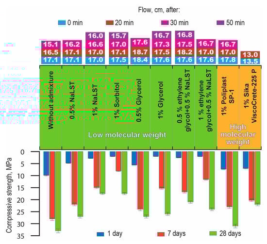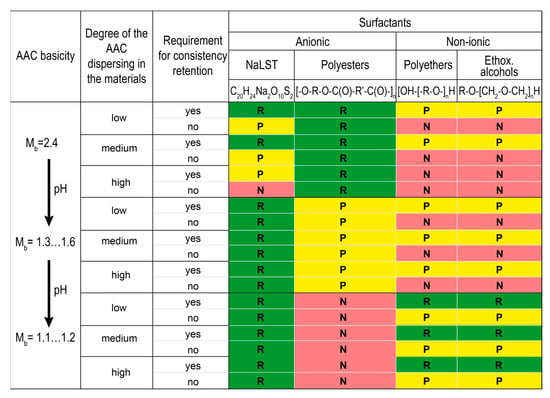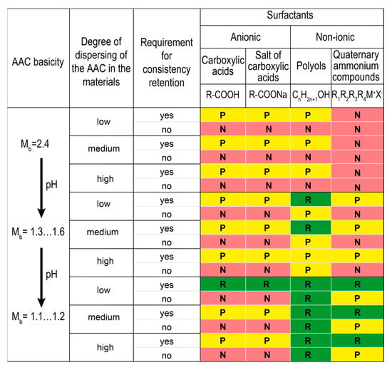 - A conclusion was made that with the decrease of the alkali-activated cement basicity from Mb = 2.4 to Mb ≤ 1.3, the content of the alkaline component should be increased. As a result, the action effect of admixtures with ester bonds (PCE) in the molecular structure due to alkaline hydrolysis decreased. The substitution of anionic for cationic or nonionic surfactants increased the action effect, with its dependence from the surfactant molecular weight decreasing. The use of polyhydrosiloxane in conjunction with NaLST was effective for obtaining the desirable effect from plasticization, regardless of the alkali-activated cement basicity, especially with regard to the surface activity of nonionic surfactants.