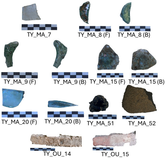 Nine samples were collected from the Archaeological Park of Tindari (Italy) (Figure 2), including two bricks of uncertain age from the theatre, five archaeological glass sherds excavated from the Cercadenari area during various excavation campaigns, a millstone made of volcanic rock, and an obsidian fragment (Figure 3). Specifically, TY_MA_7 is a colorless thin glass fragment, while TY_MA_8 and TY_MA_9 are green glass fragments. These three samples, together with the obsidian fragment (TY_MA_51), were recovered during the August 1970 excavation campaign in the Cercadenari area, specifically from the decumanus, quadrants P19-20–21, layer II. In addition, two further glass fragments were analyzed: TY_MA_15, a base fragment of a glass container discovered in the same area during the July 1993 excavation, and TY_MA_20, a wall fragment of a glass vessel uncovered in the 2023 excavation campaign conducted by the University of Torino (Excavation XVIII-US 667). A fragment of a millstone (TY_MA_52) was sampled from near the main entrance of the Archaeological Park, but no information about the excavation context is available. Finally, TY_OU_14 and TY_OU_15 are bricks located at the central niche in the ring corridor in the theatre orchestra.