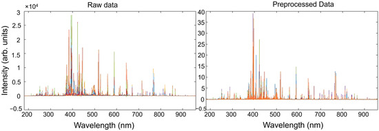 Spectral data acquired from the standard samples, allocated in the X matrix, were pre-processed prior to performing multivariate regression vs. the Y concentration matrix. As was previously stated, common issues for LIBS spectra analysis include baseline fluctuations and varying sensitivity among elements. To address these issues, the most commonly adopted approach involves baseline correction and spectral normalization. To this end, a pre-processing step based on the Whittaker filter, followed by a SNV, was carried out. The parameters of the Whittaker filter were chosen to effectively model the baseline while minimizing low-frequency oscillations. A regularization parameter of λ = 100 was selected to impose sufficient smoothness on the estimated baseline without excessively flattening relevant spectral features. The penalty factor p = 0.001 was chosen to allow a degree of sensitivity to subtle baseline variations, improving the separation of weak peaks from the background. This combination enhances the signal-to-noise ratio, particularly for low-intensity spectral lines, which is critical for accurate elemental identification in LIBS analysis. The parameters were initially based on values reported by Nardecchia et al. [58], and subsequently adjusted to optimize performance on the specific dataset used in this work. The impact of such pre-treatments on the LIBS spectra of standard samples, shown in different colors, is illustrated in Figure 4. In parallel, the airPLS algorithm [72] was also tested as an alternative method to the Whittaker filter for baseline correction, offering an adaptive, data-driven approach to suppress background noise while preserving peak integrity. Also, in this case, after baseline correction, the pre-treated spectra were normalized with a SNV transformation. Parameters for the airPLS algorithm were: λ = 105, order of the difference of penalties = 2, Weight of Exception Proportion (WEP) = 0.1, asymmetry p = 0.5, maximum number of iterations = 20. The impact of the use of two different baseline pre-treatments on the calibration and validation performance is discussed later.