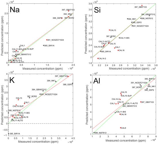 Plot of predicted (obtained from the PLS-VIP model) vs. measured concentration for Na, Si, K, and Al. Grey circles: standard samples used in the calibration step; red diamonds: standard samples used for validation; red lines: fitting of predicted vs. measured concentrations values during validation; green lines: ideal fitting.