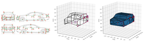 The triangular faces were selected in such a way that they form a watertight mesh. The connectivity of the keypoints was defined manually so that the individual faces belong to semantically meaningful parts of the vehicle. For example, the headlight has four corners in the Semantic Vertex Model, so in order to define triangular faces, the plane of the headlight was divided into two faces (see Figure 3). All in all, we define 128 mesh faces, for exact face definitions refer to Appendix A.