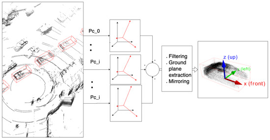 We segment the complete point cloud in timeframe t, keeping only points within the bounding box . These points are named , and are stored as. The segmented points are then translated and rotated into the target vehicle’s local coordinate system for each point at each time step: