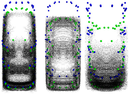Pose estimation of rigid objects such as vehicles using camera sensors and 3D models can address the aforementioned problems by reducing reliance on LiDAR sensors and extensive 3D annotation processes. Leveraging a known 3D model or point cloud of an object allows accurate estimation of its pose provided corresponding 2D-3D landmarks can be precisely identified and located in images. In multiple view geometry in computer vision [27], this problem is referred to as the Perspective N Point (PNP) problem. The landmarks, historically, are keypoints detected by feature detectors such as SIFT [28] and ORB [29] to which a 3D point corresponds. The associated 3D point cloud is usually reconstructed by leveraging the geometry of a camera motion or calibrated multi-view computer vision. Provided four or more non-coplanar keypoints can be re-identified, the pose of the camera with respect to the keypoints can be unambiguously solved [30]. This principle is frequently used in Structure from Motion [27], V-SLAM (Visual Simultaneous Localization and Mapping) [31] and industrial pose estimation applications [32]. Traditional, feature-based keypoints, however, cannot easily be re-identified later in different lighting conditions or from significantly different viewpoints. Semantic keypoints, detected via neural networks [33,34], provide a robust alternative. These category-specific keypoints carry human-understandable semantic information, which makes them invariant to changes in viewpoint and lighting. The neural network-based detection of these, although far more robust and meaningful, is significantly noisier, making classical triangulation-based reconstruction and pose estimation impractical. The earliest method of using these keypoints to estimate the pose of rigid bodies has been explored in recent years, and it was initially suggested by Pavlakos et al. [35]. Their approach employs a deformable CAD model for each object category and solves the pose estimation problem while also allowing regularized deformation of the model, thereby reducing failure rates stemming from model and semantic keypoint detection inaccuracies. This enables improved performance compared to exact solvers such as Epnp [30], which fail in cases of significant model error, occlusion or 2D keypoint noise [14]. Although this reduces the failure rate, it also introduces an ambiguity between the object’s pose and its model’s deformation. Barowski et al. [36] implemented a related idea using a lookup table of 3D CAD models. This works very well for their application in simulated datasets provided the CAD model is available but lacks a real-world method to reconstruct the appropriate model for the lookup table.