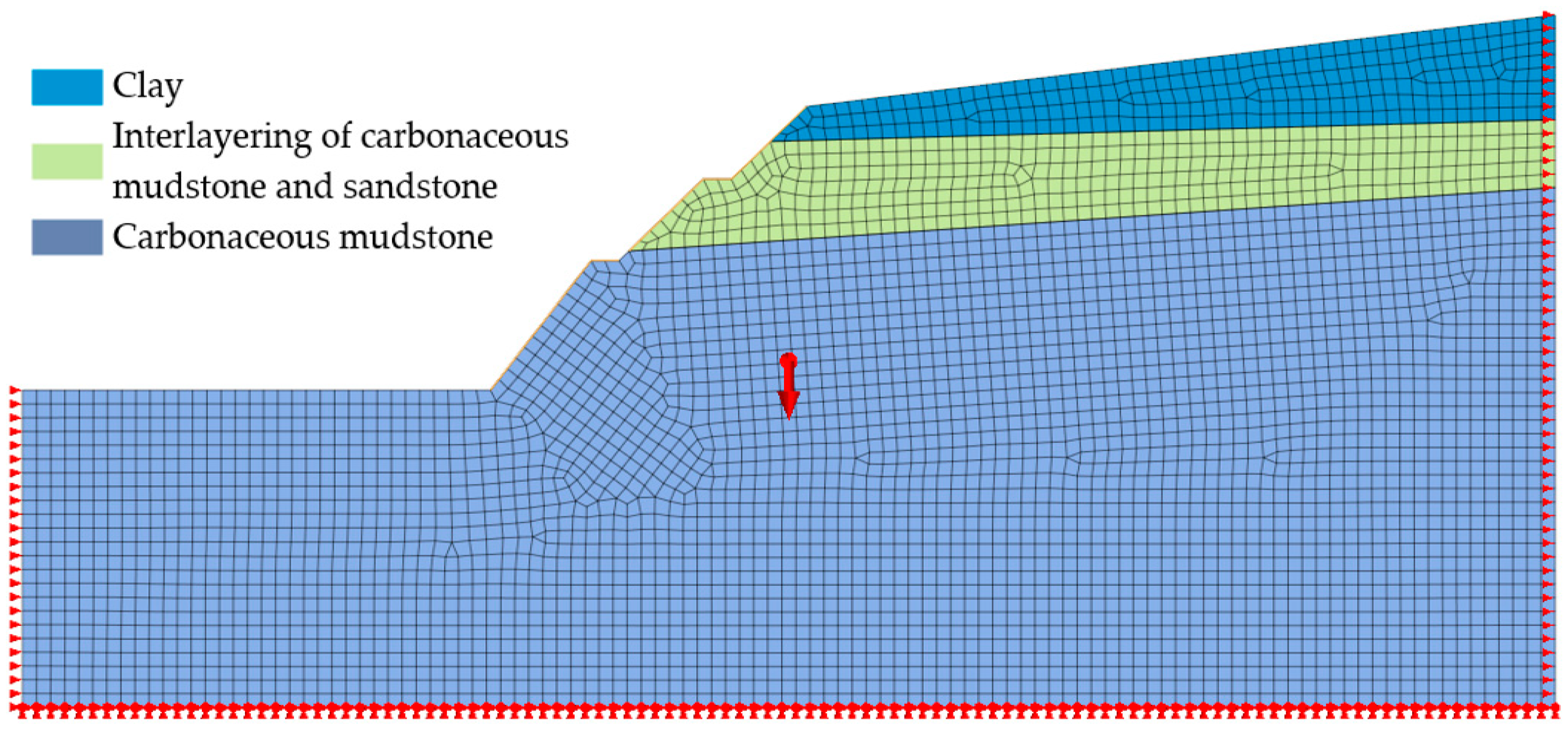 Based on on-site engineering geological surveys and core sampling results. The high slope can be divided into three rock layers: clay layer (thickness 2–3 m), interbedded carbonaceous mudstone and sandstone (thickness 10–12 m), and carbonaceous mudstone layer (thickness 15–18 m). The mechanical parameters obtained from experiments are used as the mechanical parameters of each rock layer, as shown in the Table 3. Considering the stress–strain characteristics of carbonaceous mudstone, this model uses the Mohr Coulomb criterion as the basis for describing the mechanical behavior of slopes. The determination of key parameters is mainly obtained through in-situ shear tests and laboratory physical performance tests, especially in Section 4.3 where the cohesion and internal friction angle of carbonaceous mudstone are determined to ensure the reliability of the selected parameters.