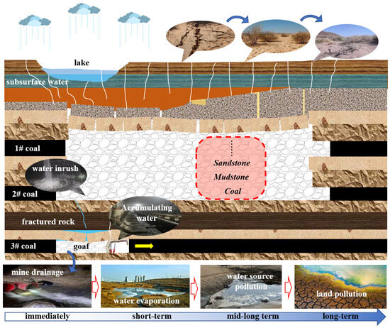The mining of shallow coal seams severely disrupts groundwater equilibrium, adversely impacting the mining area’s ecology and increasing mine water inflow [1,2,3,4]. In China, coal resources and water resources exhibit an inverse spatial distribution. Due to policy-driven development, western regions have emerged as the primary coal-producing areas. As illustrated in Figure 1, the typical geological characteristics of shallow buried coal seam groups include multi-seam intervals, argillaceous soft rock layers, and sandy hard rock structures [5]. These regions face water scarcity and ecological fragility, exacerbated by high-intensity coal mining [6,7]. In 2023, the five major western coal bases accounted for over 80% of national coal production. The expansion of large-scale mining operations and soaring coal output have significantly increased goaf areas. After a mining fracture destroys the aquifer, groundwater migrates to the goaf [8,9,10].