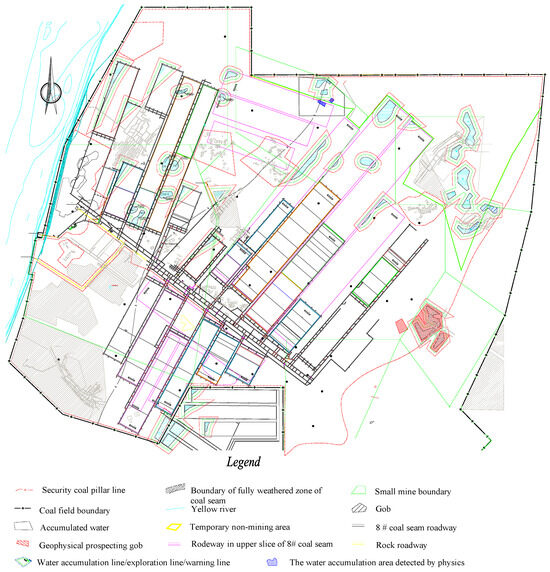 Shaping Coal Mine of Shanxi Jinshen Energy Co., Ltd. is located in Hequ County, Shanxi Province, China. The approved production capacity of the mine is 8.00 Mt/a. The mining area borders the Yellow River and represents typical shallow coal seam group mining conditions. As a model integrated resource mine, Shaping Coal Mine extracts coal seams 8 #~13 #, with overlying goafs of varying configurations—predominantly room-and-pillar and longwall mining systems. These upper goafs, containing significant water accumulation, pose potential hazards such as concealed water bodies that may impact safe and efficient extraction of underlying coal seams. Figure 3 illustrates the spatial distribution of these upper goafs and their water accumulation characteristics.