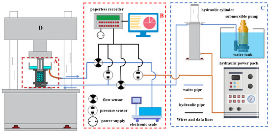 Compaction–seepage experimental system. A is the seepage device, B is the data acquisition system, C is the seepage water pressure control system, and D is the loading system.