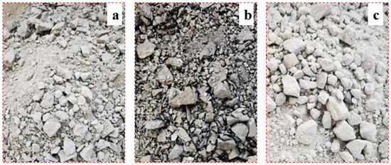It can be seen from the Taibo gradation formula that the preparation of continuously graded rock samples is independent of the density of rock samples and is only related to the mass ratio of broken rock in each particle size range. The prepared η = 0.5 sample is shown in Figure 6.