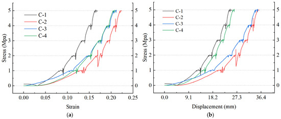 In the compaction seepage experiment of lithological combination samples, the axial stress was 0–5 MPa, and 1 MPa was used as the graded loading gradient to test the seepage characteristics under 0 MPa, 1 MPa, 2 MPa, 3 MPa, 4 MPa, and 5 MPa axial stress. The ‘stress-displacement’ and ‘stress-strain’ recorded during the whole compaction seepage experiment are shown in Figure 7. The results show that the axial compression of 2 MPa is the dividing line. When the axial compression is less than 2 MPa, the order of strain from large to small under the same axial compression is C-2 > C-4 > C-3 > C-1. When the axial compression is greater than 2 MPa, the order of strain from large to small under the same axial compression is C-2 > C-4 ≈ C-3 > C-1. In the C-1 case, the stress decreased and then increased. The compaction curves of C-4 and C-3 are close to the same compaction characteristics after 2 MPa axial compression. Creep phenomenon is common under five-stage axial compression in the range of 1~5 MPa. The seepage water pressure of the C-3 has the least influence on the pulse of the load under constant load.