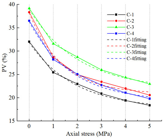 The void and bulking characteristics of each sample under different axial stresses are shown in Figure 8. The compaction characteristic parameters of the four composite samples fitted by Formula (2) are shown in Table 5.