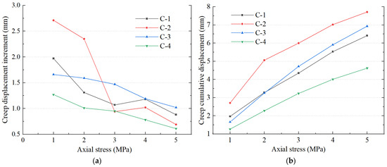 The creep amount of the load-holding stage during the compaction process is shown in Figure 9. From Figure 9a, it can be seen that the overall regularity of the change in creep amount in the same period under fixed axial stress is poor. For C-3 and C-4, the change trend of creep under each axial stress is similar. Combined with the above-mentioned stress–strain law, the compaction characteristics of C-3 and C-4 are similar as a whole. The creep amount of C-2 is greater than that of C-1 in the range of no more than 3 MPa axial compression. After the axial compression is greater than 3 MPa, the creep amount of C-1 and C-2 has the same trend, and the creep amount of C-1 is greater than that of C-2. However, the overall regularity of creep accumulation under each axial stress is good. As shown in Figure 9b, the creep accumulation is sorted into two sections from large to small. No more than 2 MPa: C-2 > C-1 > C-3 > C-4; more than 2 MPa: C-2 > C-3 > C-1 > C-4.