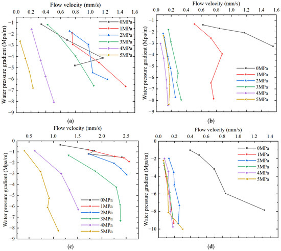 The results show that the seepage characteristics of C-1 change from unstable to stable in the range of 2–3 MPa. Subsequently, for the convenience of narration, the axial compression interval in which the seepage characteristics change from unstable to stable is called seepage stabilized axial compression (SSAC). In the axial compression range of 3~5 MPa, the permeability decreases by one order of magnitude for each 1 MPa increase, the flow rate decreases sharply, and the nonlinear seepage characteristics are stable. The SSAC of C-2 is 1~2 MPa, and the flow velocity decreases sharply under the axial stress of 1 MPa, and then the decrease of flow velocity becomes smaller. The SSAC of C-3 is 0~1 MPa. In the axial compression range of 3~5 MPa, the flow velocity decreases obviously with the increase of 1 MPa, and the flow velocity tends to be stable with the increase in water pressure gradient. The flow velocity of C-4 decreased sharply after axial compression loading. With the gradual compaction, the flow velocity changed little and fluctuated in a small range. In the case of various lithological combinations, the flow velocity of sandstone and coal composite specimens under the same axial stress is the largest. The remaining samples have mudstone combinations, and the variation range of flow velocity is close.