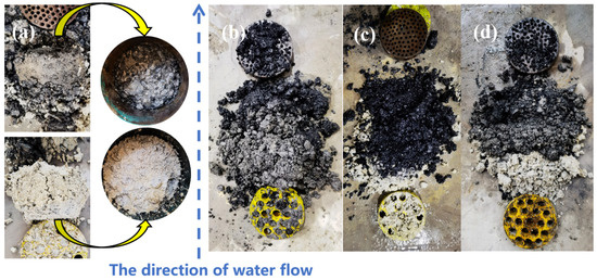 The samples obtained after the compaction seepage experiment of the lithology combination broken rock: (a) C-1; (b) C-2; (c) C-3; (d) C-4.