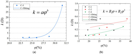φ-k fitting curve of broken rock in lithology combination: (a) no mudstone; (b) contains mudstone.