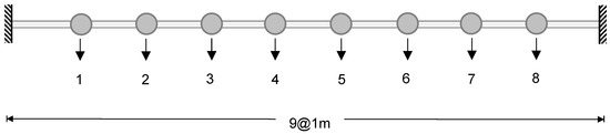 The simulation example features a fixed-fixed beam modeled with ten nodes and eight identical lumped masses, as shown in Figure 1. The flexural rigidity, EI for the beam is taken as 5.1752 × 105 kN.m2 so that the fundamental frequency is 1 Hz in the undamaged state. Sensors measuring acceleration in the vertical direction are assumed to be present at each of the lumped mass locations. Viscous dissipation is included in the form of proportional damping with a magnitude of 5% of critical.