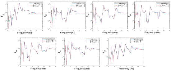 Transmissibilities between successive coordinates: Baseline state versus Damage Case3 (No measurement noise).