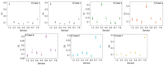 Following the detection stage, damage localization results utilizing the proposed index for the simulation cases are obtained and visually summarized in the box plot given in Figure 4 for comparison. It is noteworthy that for all the damage scenarios, the correct location has been identified, with the index reaching its peak at the truly damaged segment. However, unlike the noise-free case where DI fluctuates around 0.9, the median value for the normalized DI is around 0.3 for the noisy data. Nevertheless, it still leads to correct localization by identifying the damaged member with the highest DI, while the index for the remaining members remain clustered around 0.1. The only exception to this clear distinction between two clusters is D.Case 6, for which a few misclassifications occurred in the previous stage of damage detection. DI for the segment between sensors 7–8 has deviated from those of the remaining undamaged segments, albeit still lower than the truly damaged segment.The sensor locations in this model-free approach serve as discrete measurement points, analogous to finite elements that represent structural behavior in a model. The choice of sensor placement significantly influences the resolution of damage localization. By employing denser sensor arrangements, resolution can be enhanced, leading to more refined and accurate identification of damage. However, denser sensors may complicate data analysis due to the larger volume of data to process, potentially increasing computational demands. Additionally, while more sensors can enhance resolution, they may also amplify the effects of measurement noise, making it more challenging to distinguish between true damage and noise. Therefore, a careful balance must be achieved between sensor density and the overall complexity of the analysis.